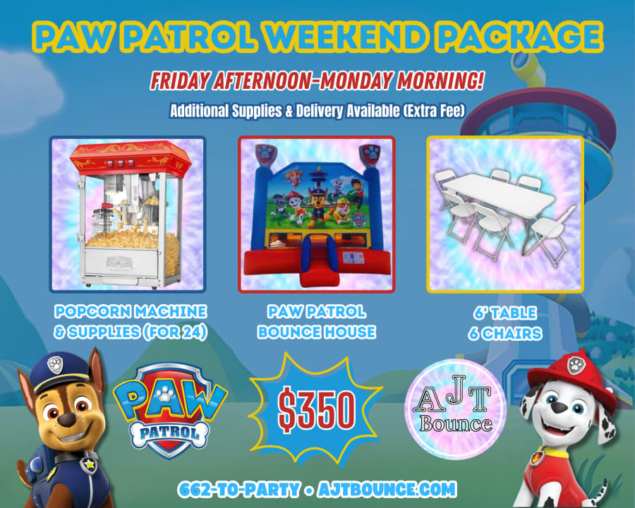 Make your little one's birthday celebration a hit with our exclusive Paw Patrol Party Package! Our all-inclusive package features the popular Paw Patrol bounce house, 1 table, 6 chairs, and a popcorn machine with supplies for 24 guests. πΎπΏ