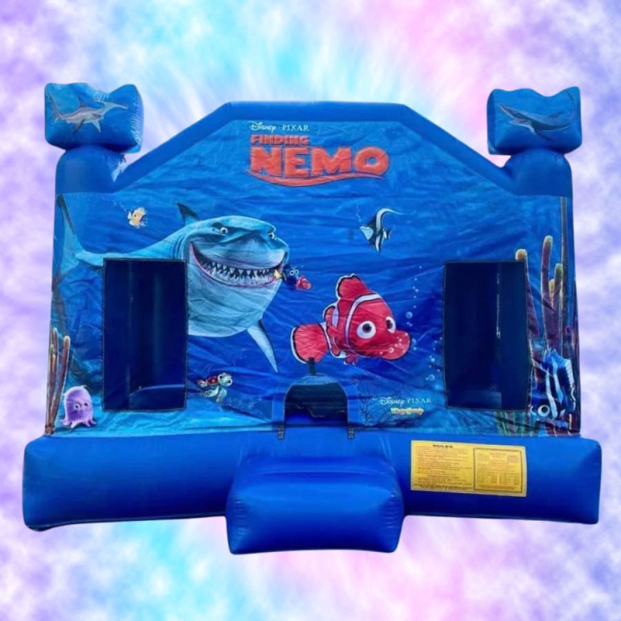 This Nemo Bounce House takes kids to the drop off point with Nemo and friends for hours of bouncing activity. Participants can imagine swimming alongside Nemo and his fish tank pals Gil, Deb and Bubbles, or touring through the ocean with Dory and Marlin, or palling around with little Squirt, the sea turtle. The trio of sharks Bruce, Chum and Anchor, round out the cast in this delightful artwork, sure to keep all Finding Nemo fans happy.
