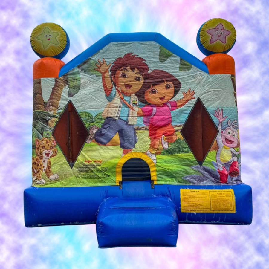 Let adventure come to life at your next event with our Diego and Dora The Explorer themed bounce house! Watch as kids embark on an exciting journey alongside their favorite adventurous duo, bouncing and exploring their way through endless fun. Perfect for birthday parties, school events, or any occasion where imagination and play unite, our bounce house will be the highlight of the day, creating unforgettable memories for all who join the adventure!