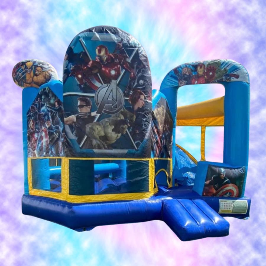 Designed with the hottest comic book superheroes in mind, this exceptional inflatable boasts incredible design, consisting of the most popular Marvel and DC characters on the planet! Inside you will find inflated pop-ups, hurdles, a small ladder climb followed by a slide, as well as a mini inflated basketball net, all upon a bouncy surface!