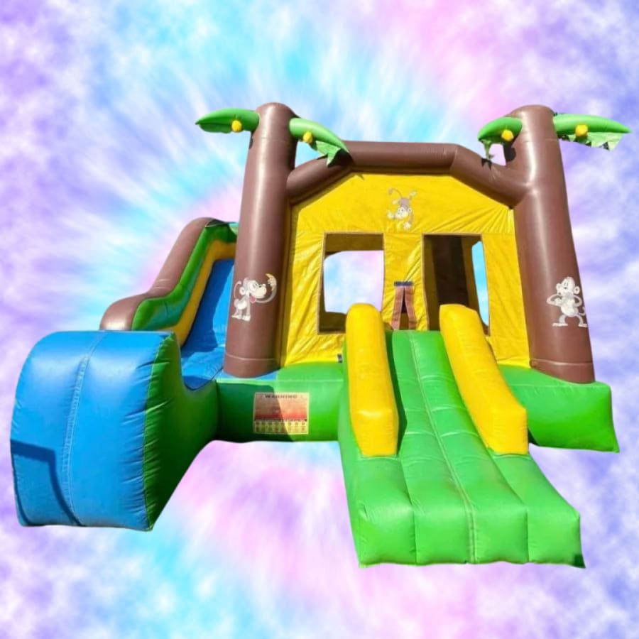 Your child will go bananas over our monkey jungle themed combo bounce house and slide inflatable! Inside this combo bounce you will find a large bouncing area, a basketball hoop and a ladder up to the top where you can slide your way down!