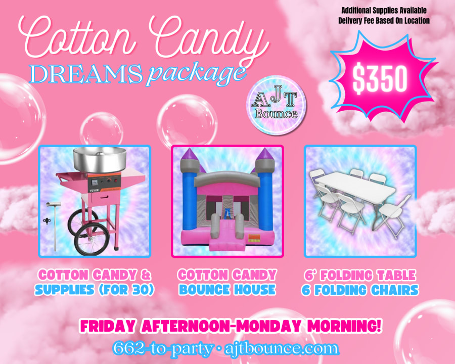 Our Cotton Candy Dreams package includes everything you need for a fantastic party experience. You'll receive our colorful and exciting cotton candy bounce house, along with 1 table and 6 chairs to ensure your guests have a comfy place to relax and enjoy the festivities. And that's not all - we also provide a top-of-the-line cotton candy machine with supplies for up to 30 people! 🍬