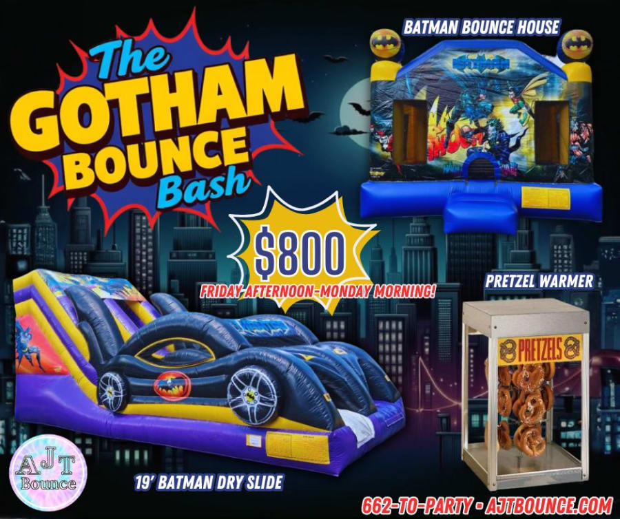 • 🦇 Bounce House for high-flying, crime-fighting fun • 🏙️ 19’ Dry Slide Inflatable for daring Gotham-style escapes • 🥨 Pretzel Warmer to keep your heroes fueled and ready for action